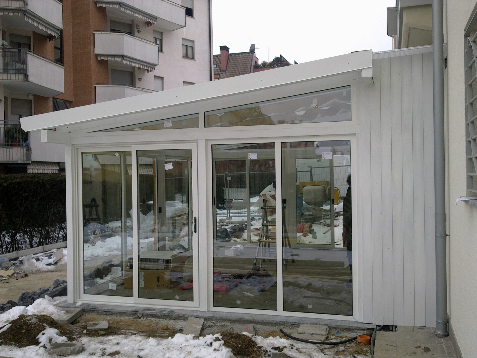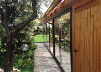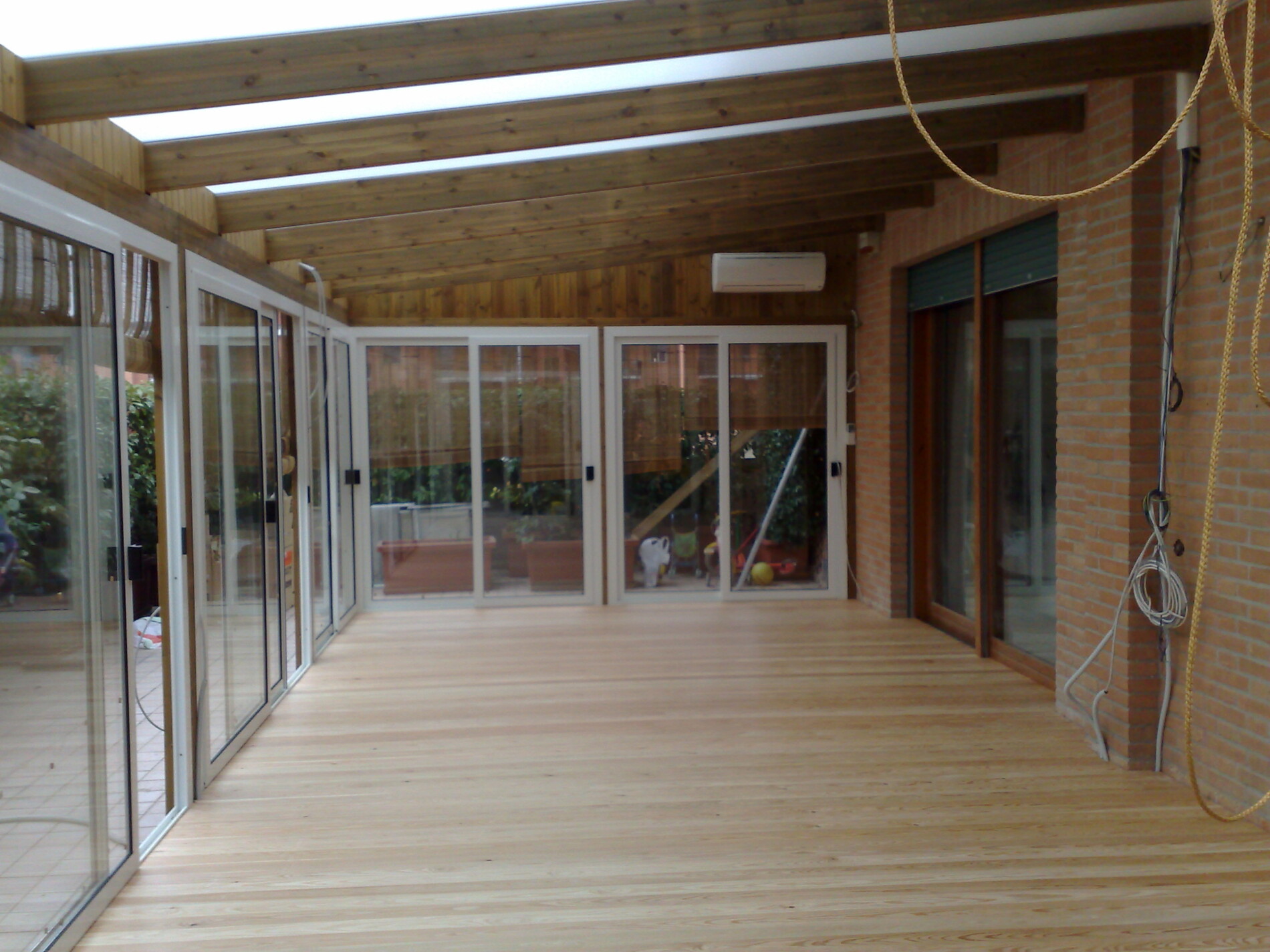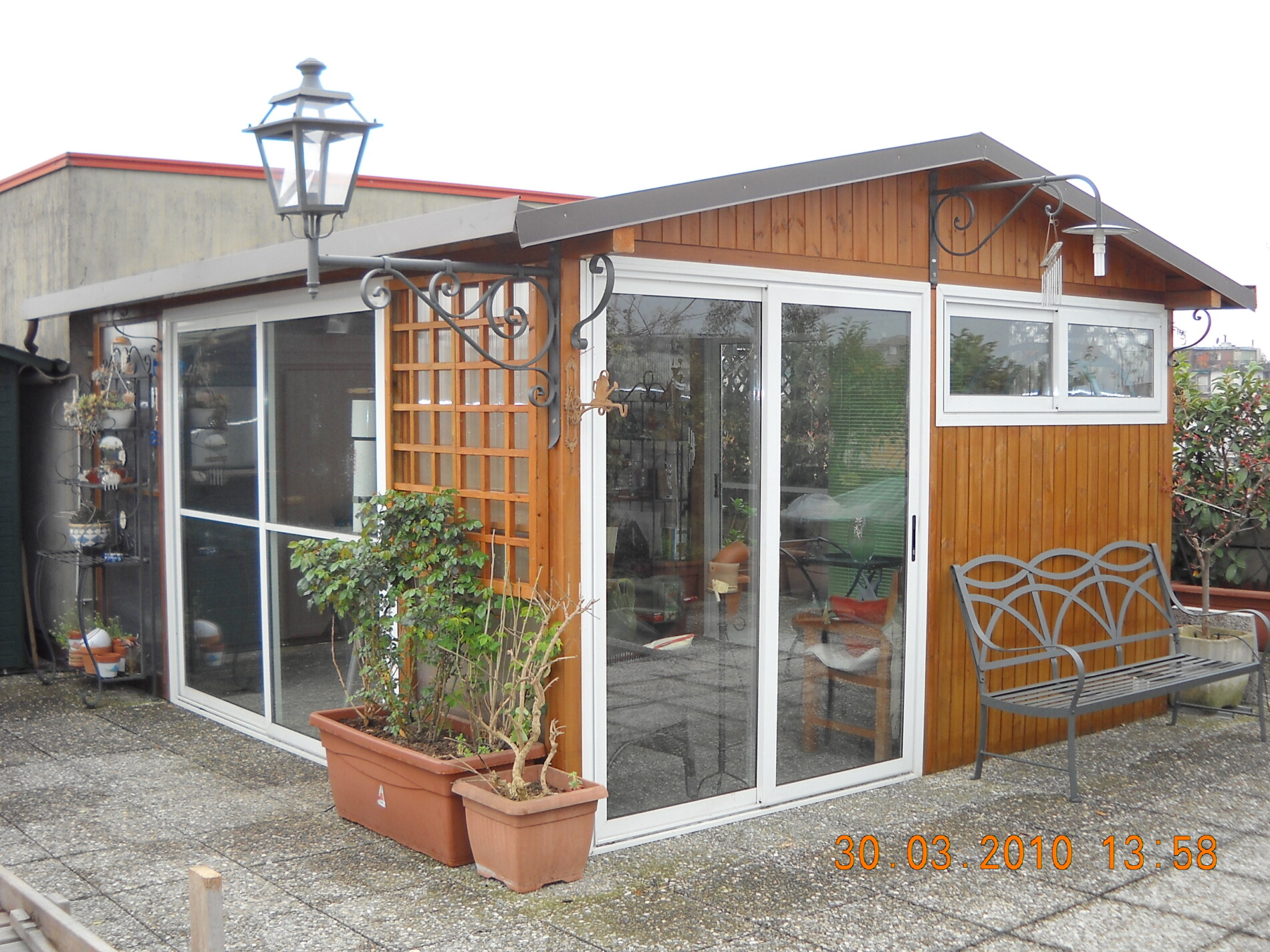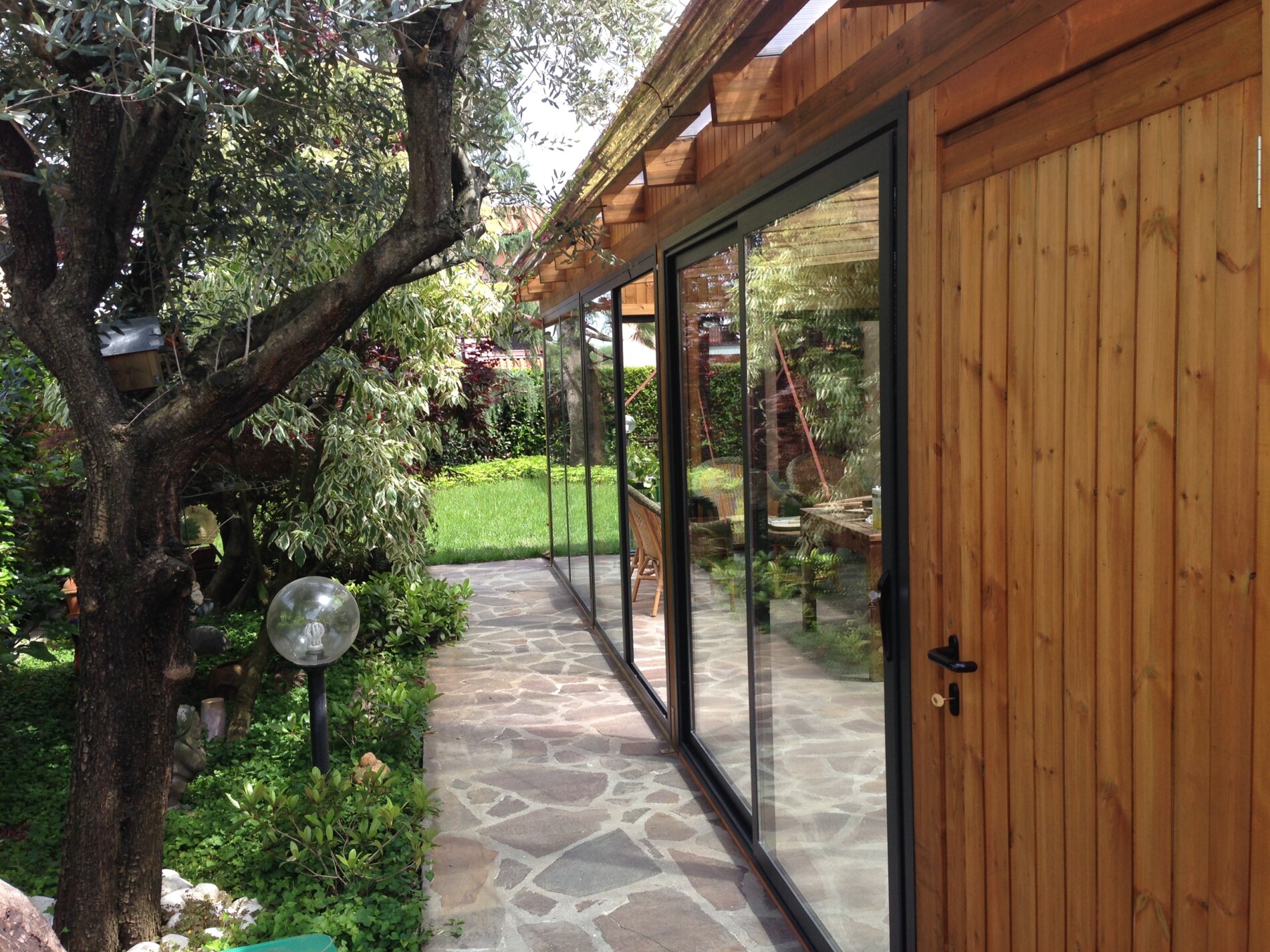 Verande: La veranda è una struttura versatile che può essere “addossata“, ovvero con una sezione appoggiata ad una parete, oppure “autoportante“. In quest’ultimo caso, la struttura si regge integralmente sui quattro pilastri e può essere collocata autonomamente all’interno di un giardino o terrazzo. Si possono fissare con ancoraggi importanti o semplicemente agganciare a murature esistenti o porre delle fioriere come zavorre. I materiali per realizzare le verande sono innumerevoli, in particolare legno, ferro e alluminio. Si intende veranda una struttura con copertura definitiva ed isolata con chiusure vetrate sui lati o pannellatura in perlinato. La struttura può essere in legno, ferro o alluminio.