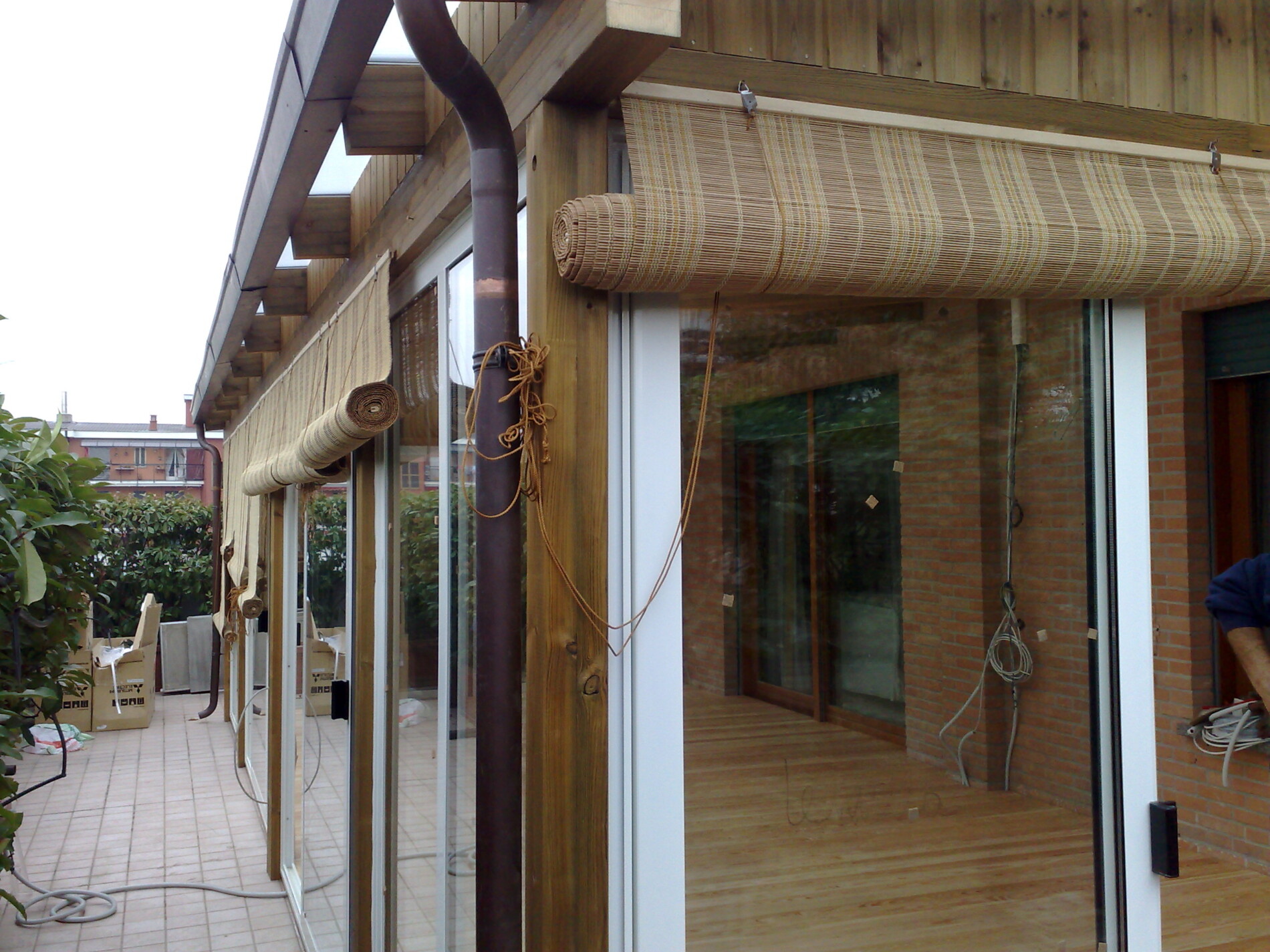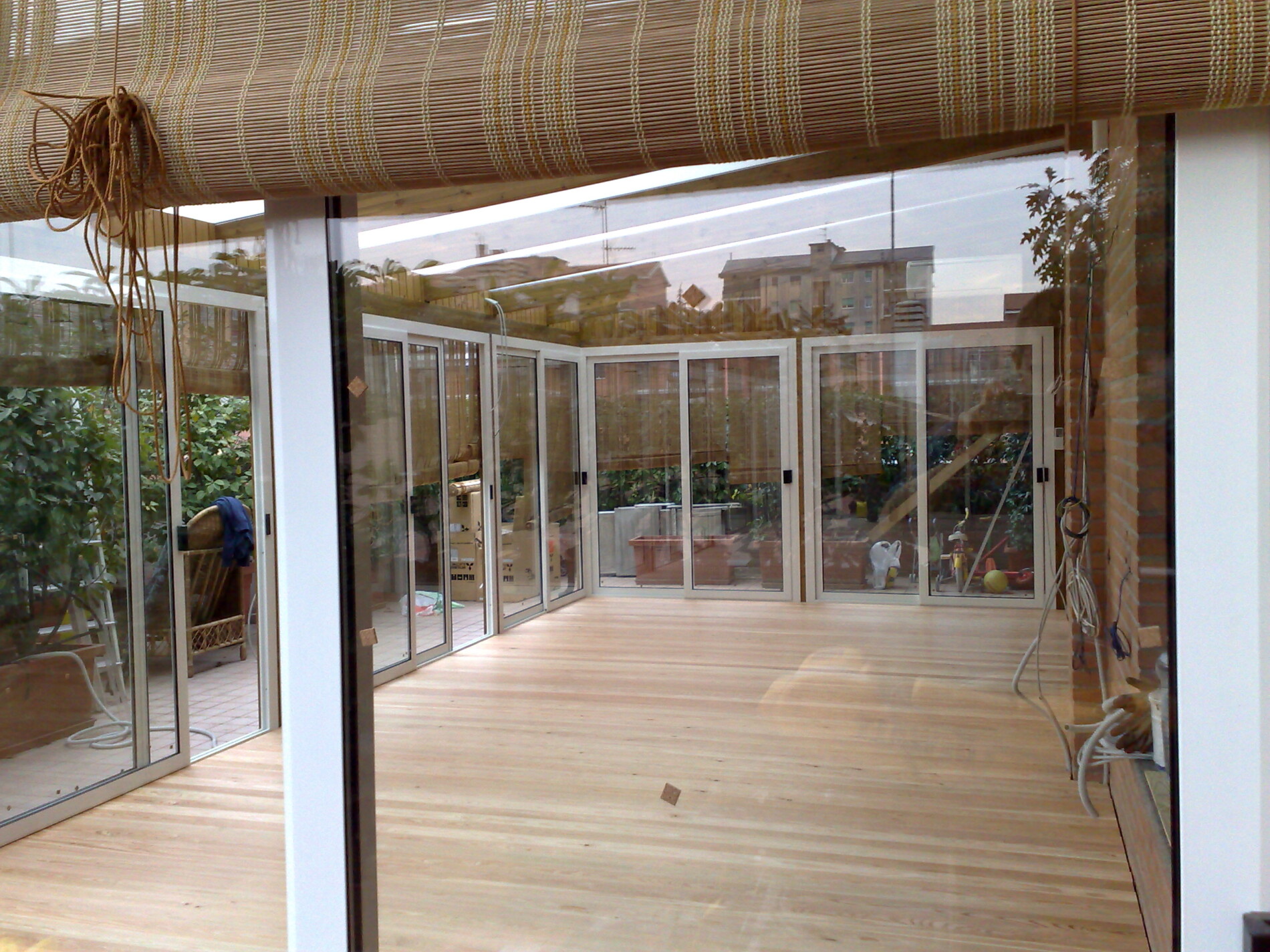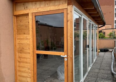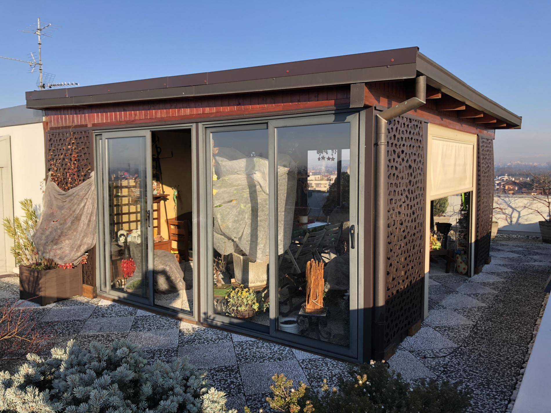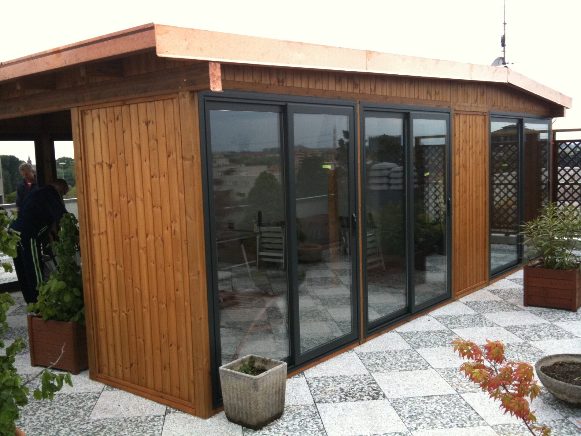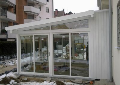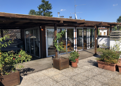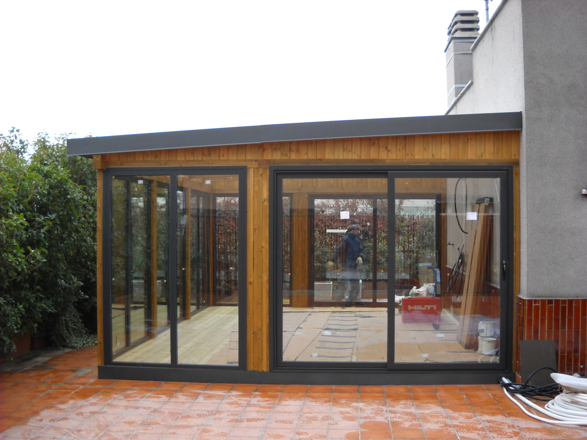 Verande: La veranda è una struttura versatile che può essere “addossata“, ovvero con una sezione appoggiata ad una parete, oppure “autoportante“. In quest’ultimo caso, la struttura si regge integralmente sui quattro pilastri e può essere collocata autonomamente all’interno di un giardino o terrazzo. Si possono fissare con ancoraggi importanti o semplicemente agganciare a murature esistenti o porre delle fioriere come zavorre. I materiali per realizzare le verande sono innumerevoli, in particolare legno, ferro e alluminio. Si intende veranda una struttura con copertura definitiva ed isolata con chiusure vetrate sui lati o pannellatura in perlinato. La struttura può essere in legno, ferro o alluminio.