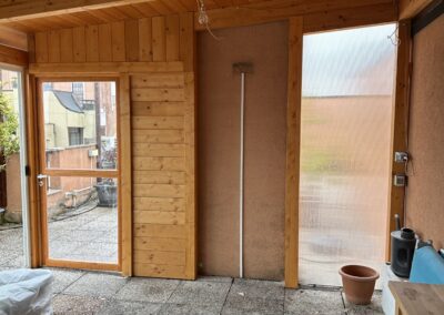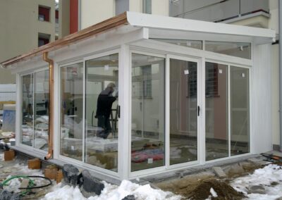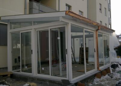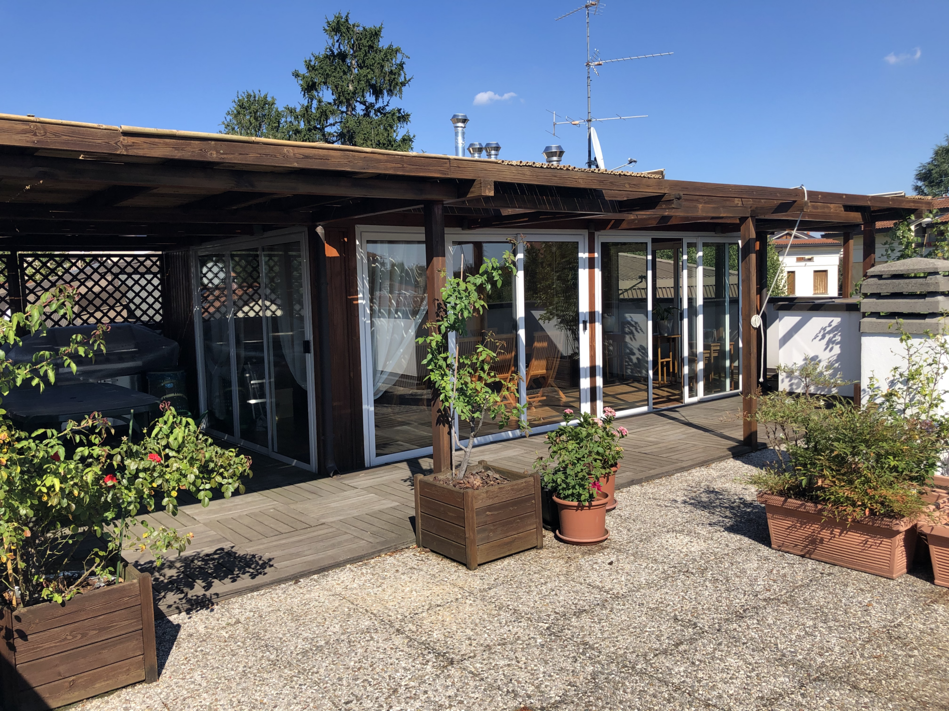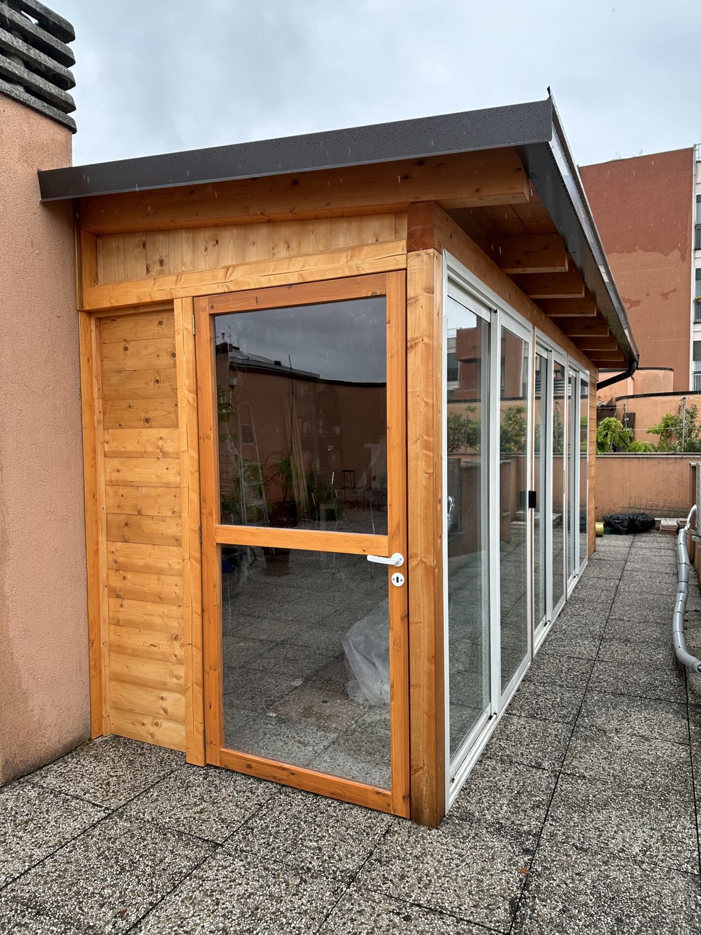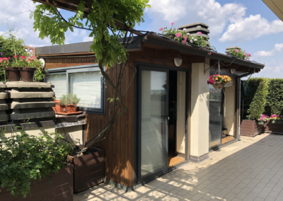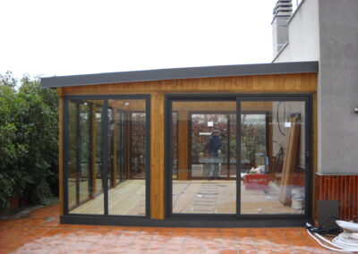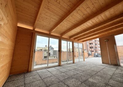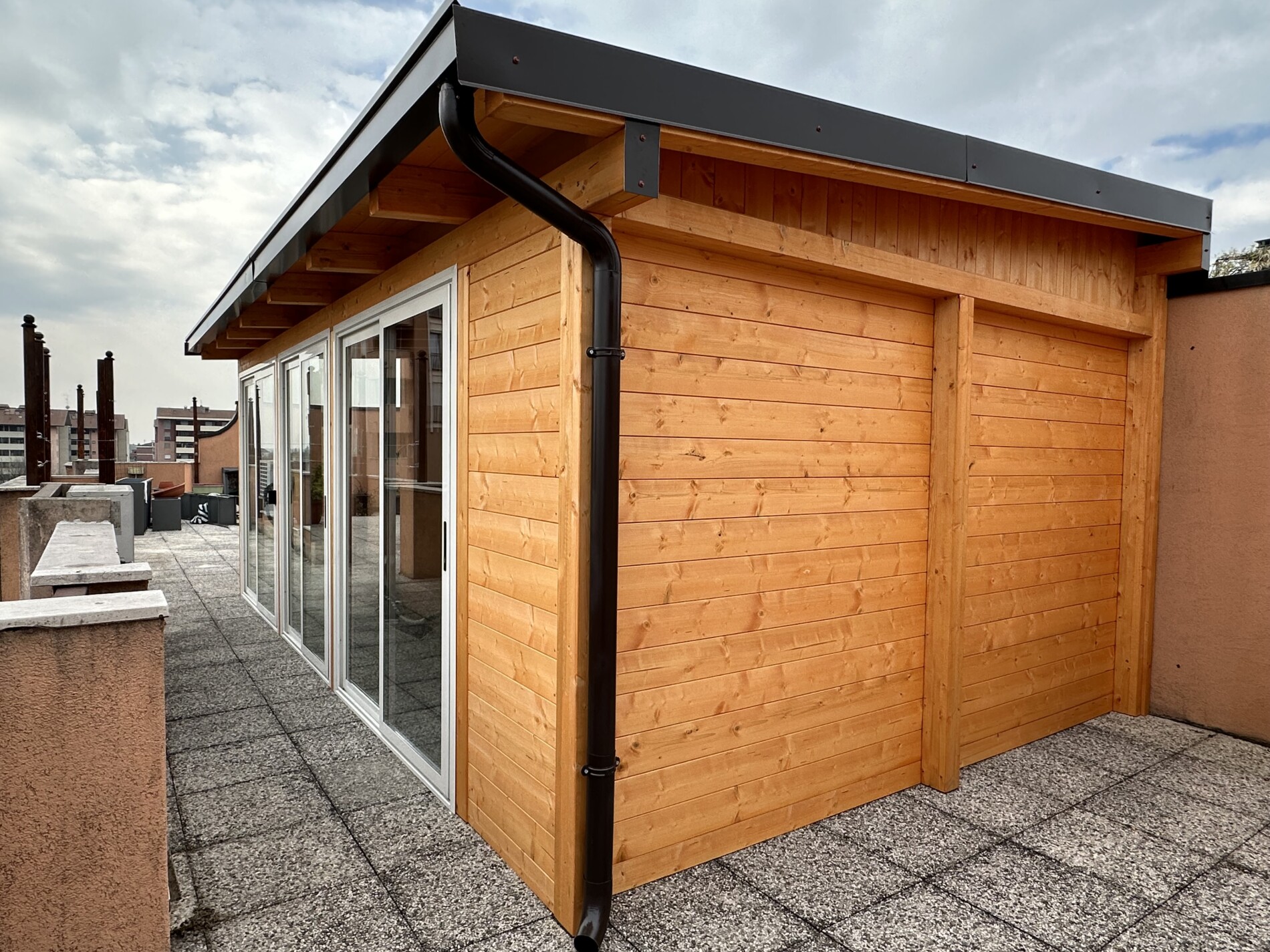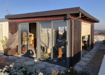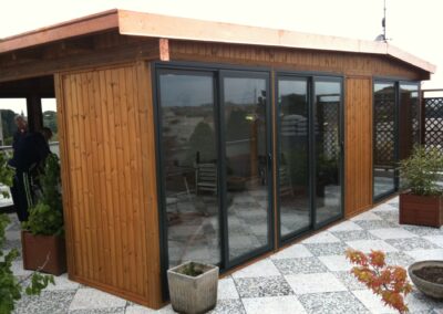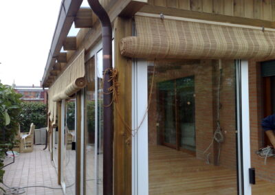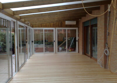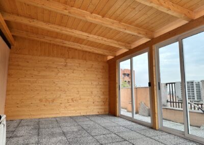 Verande: La veranda è una struttura versatile che può essere “addossata“, ovvero con una sezione appoggiata ad una parete, oppure “autoportante“. In quest’ultimo caso, la struttura si regge integralmente sui quattro pilastri e può essere collocata autonomamente all’interno di un giardino o terrazzo. Si possono fissare con ancoraggi importanti o semplicemente agganciare a murature esistenti o porre delle fioriere come zavorre. I materiali per realizzare le verande sono innumerevoli, in particolare legno, ferro e alluminio. Si intende veranda una struttura con copertura definitiva ed isolata con chiusure vetrate sui lati o pannellatura in perlinato. La struttura può essere in legno, ferro o alluminio.